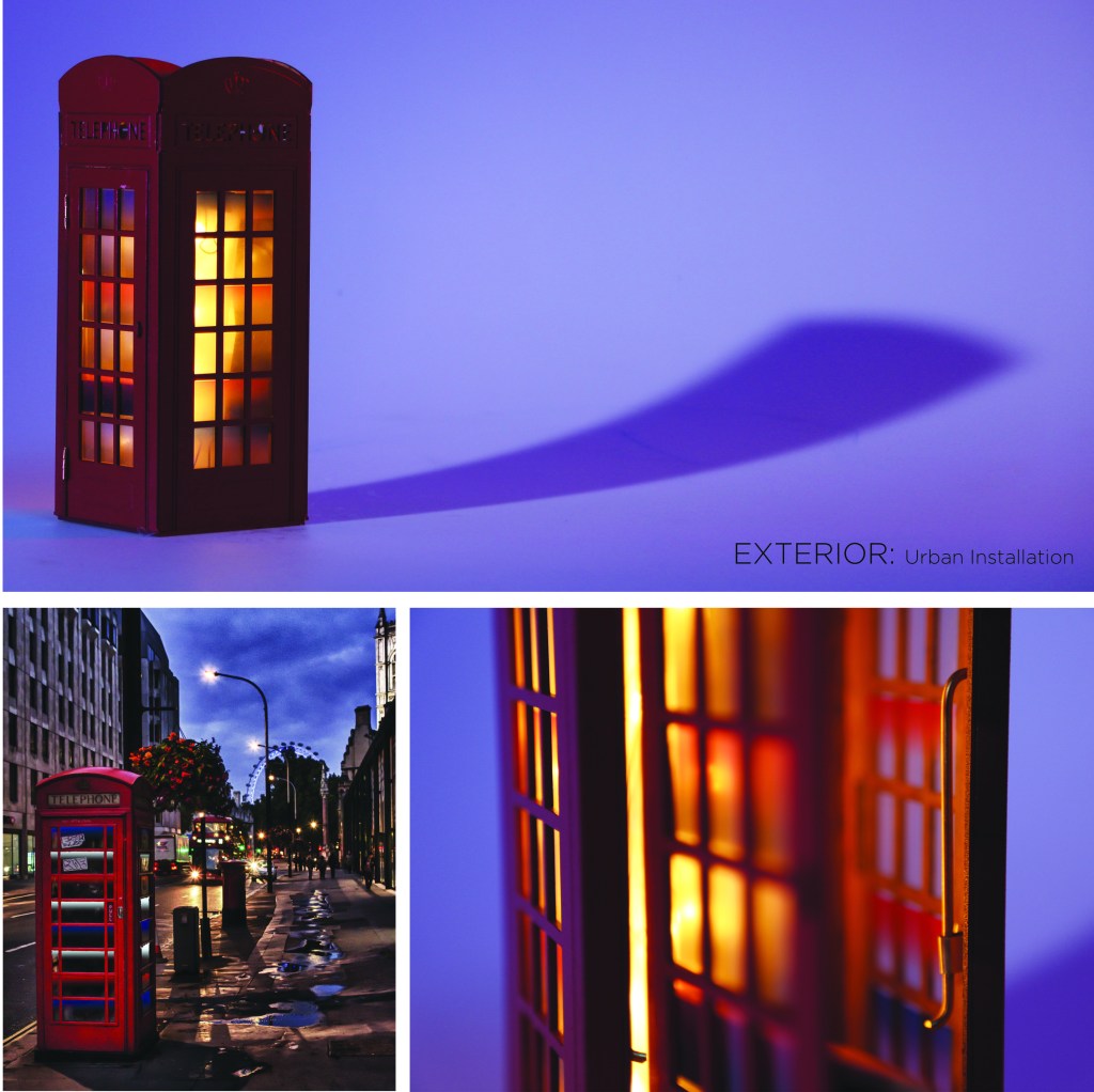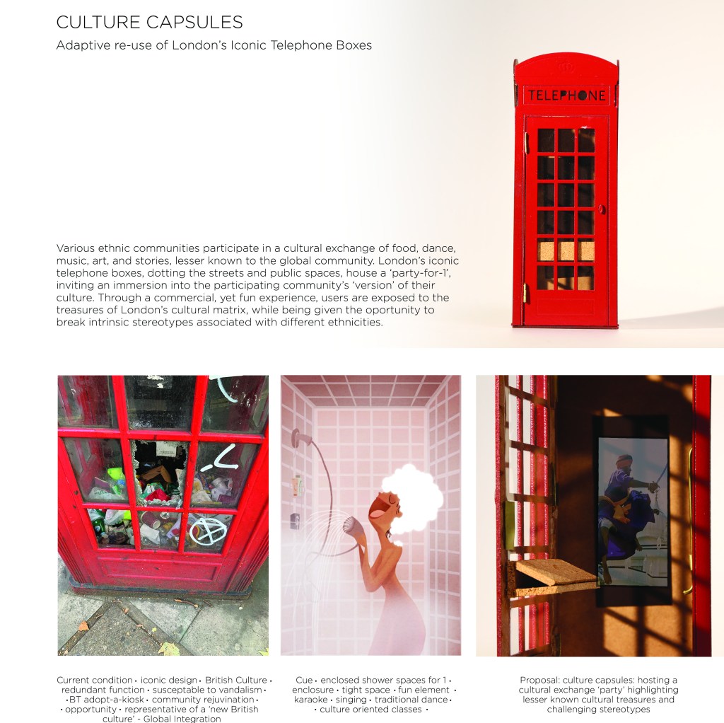 Suggesting evolutionary adaptation for London’s iconic telephone boxes, I proposed an immersive cultural experience aimed at conscious exchange and breaking stereotypes, through direct participation of ethnic communities; inspired by the ‘prosumers’ concept introduced by Tim Parsons in Thinking: Objects9.