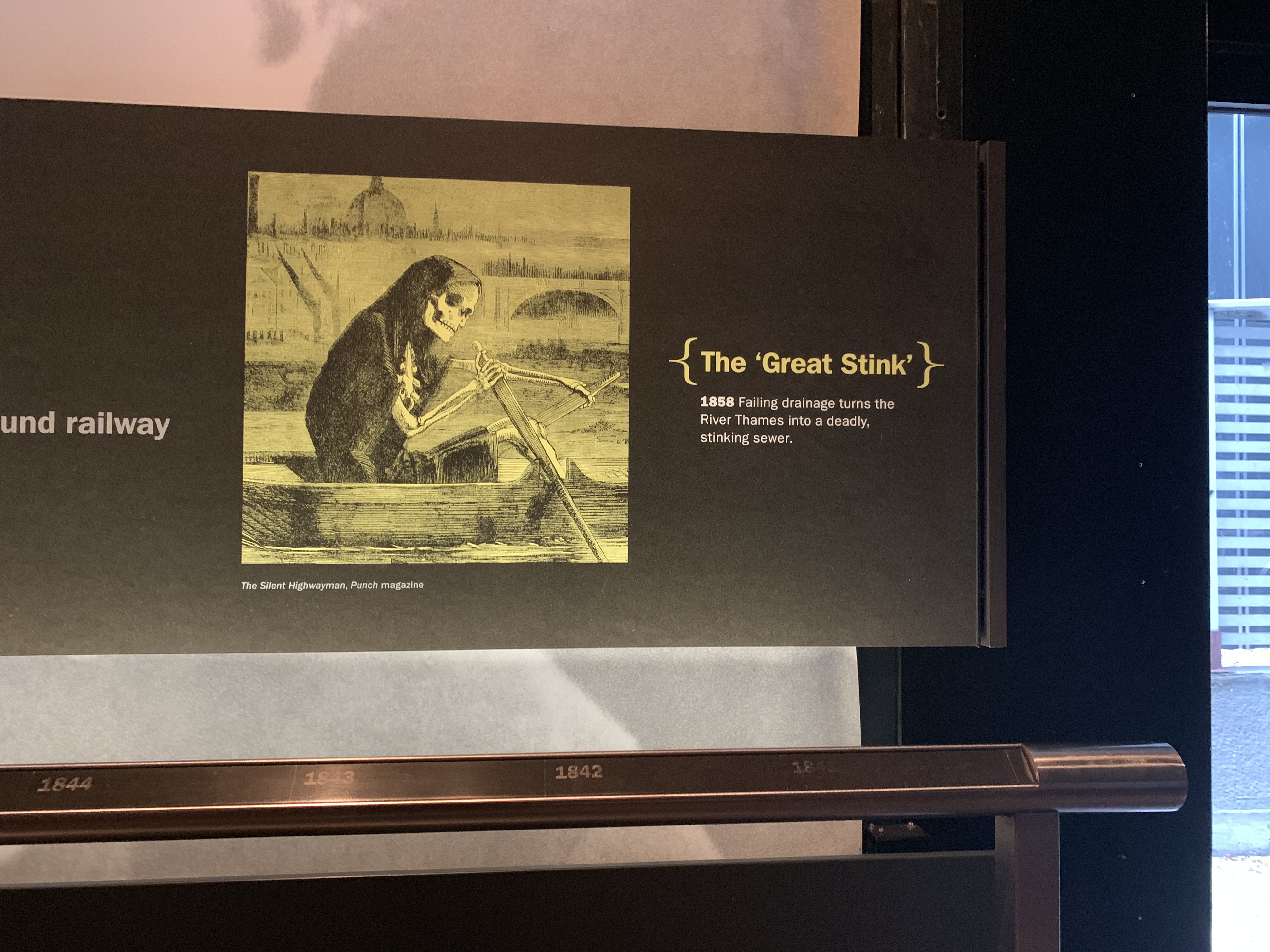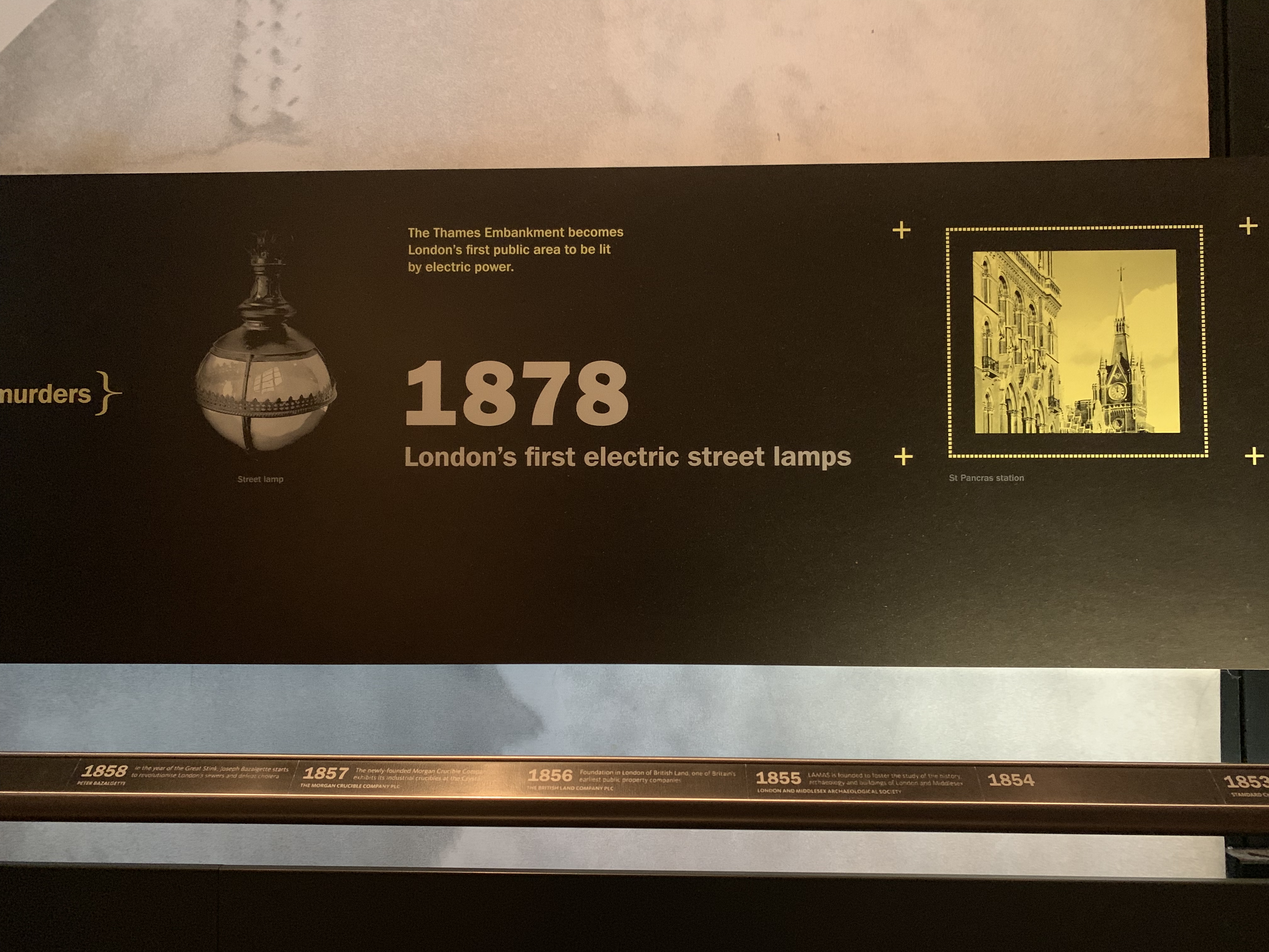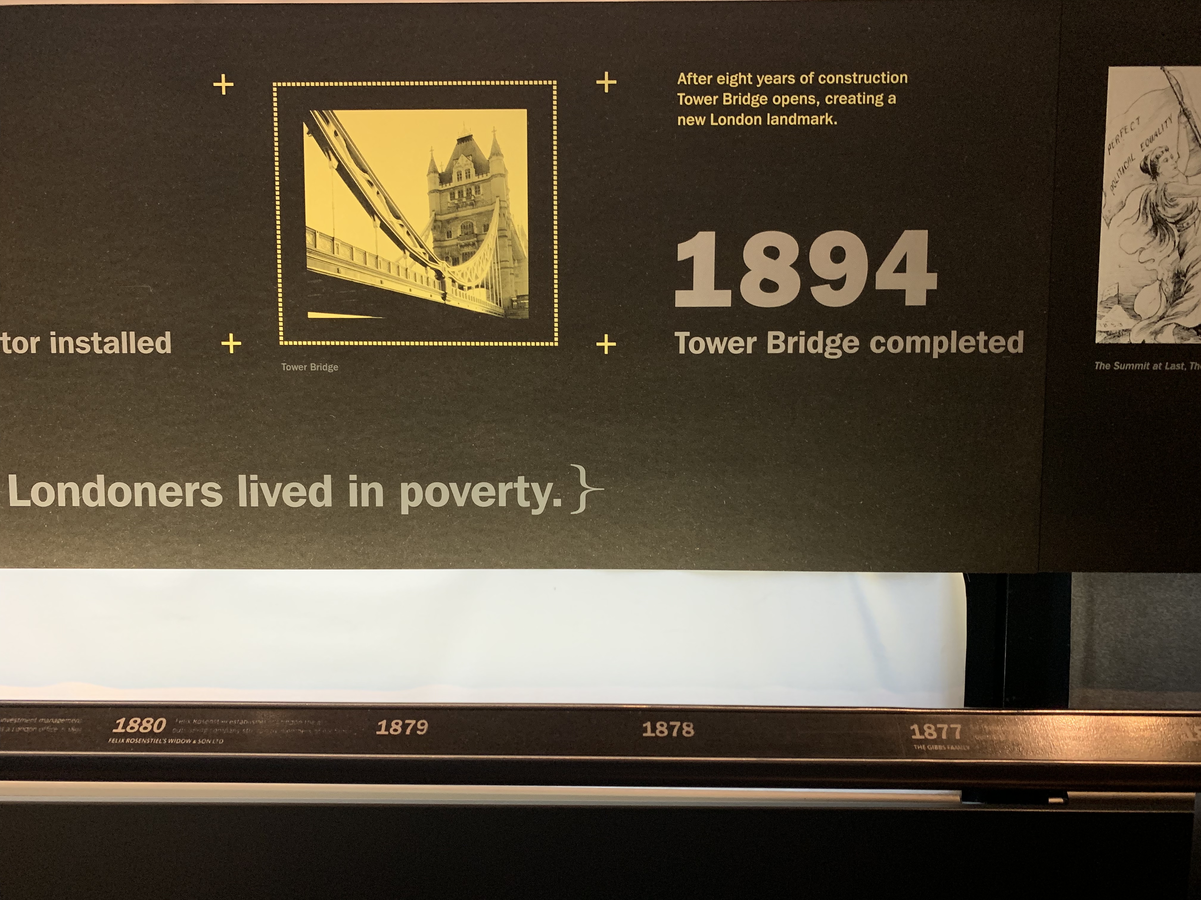 The timeline ribbon also captured the major technological issues and developments during the 19th century, including problems of drainage, introduction of electric street lamps, and the construction ot the Tower bridge across the Thames.