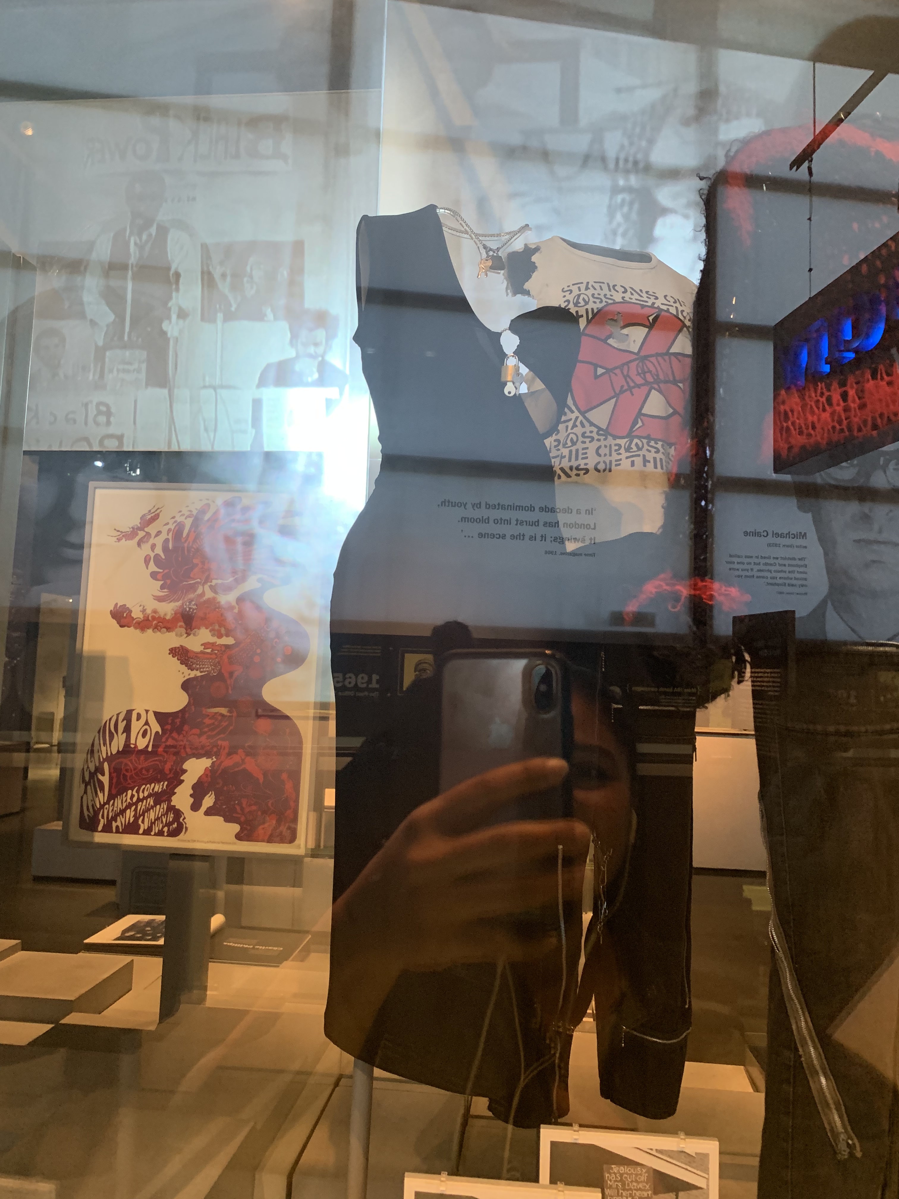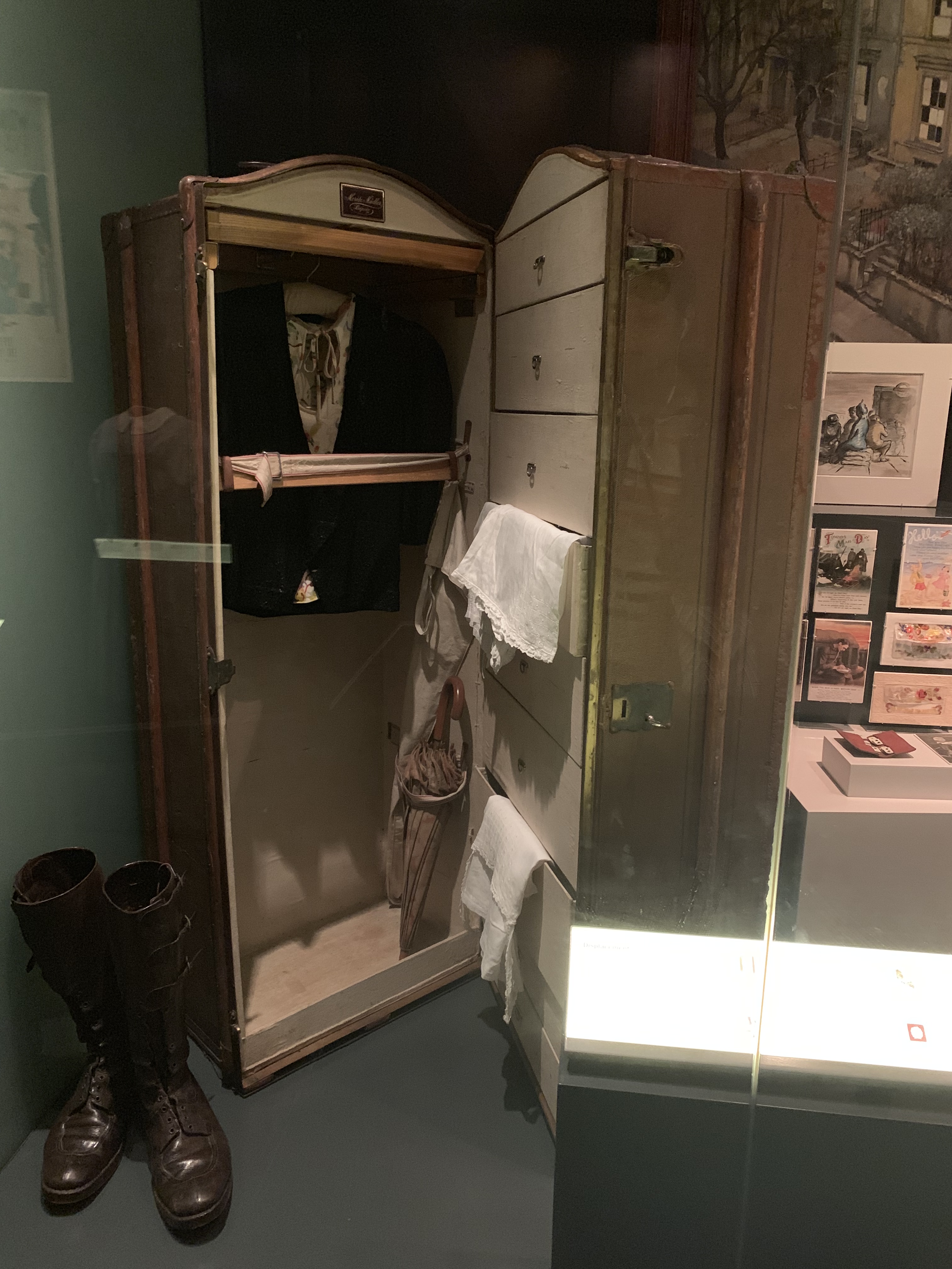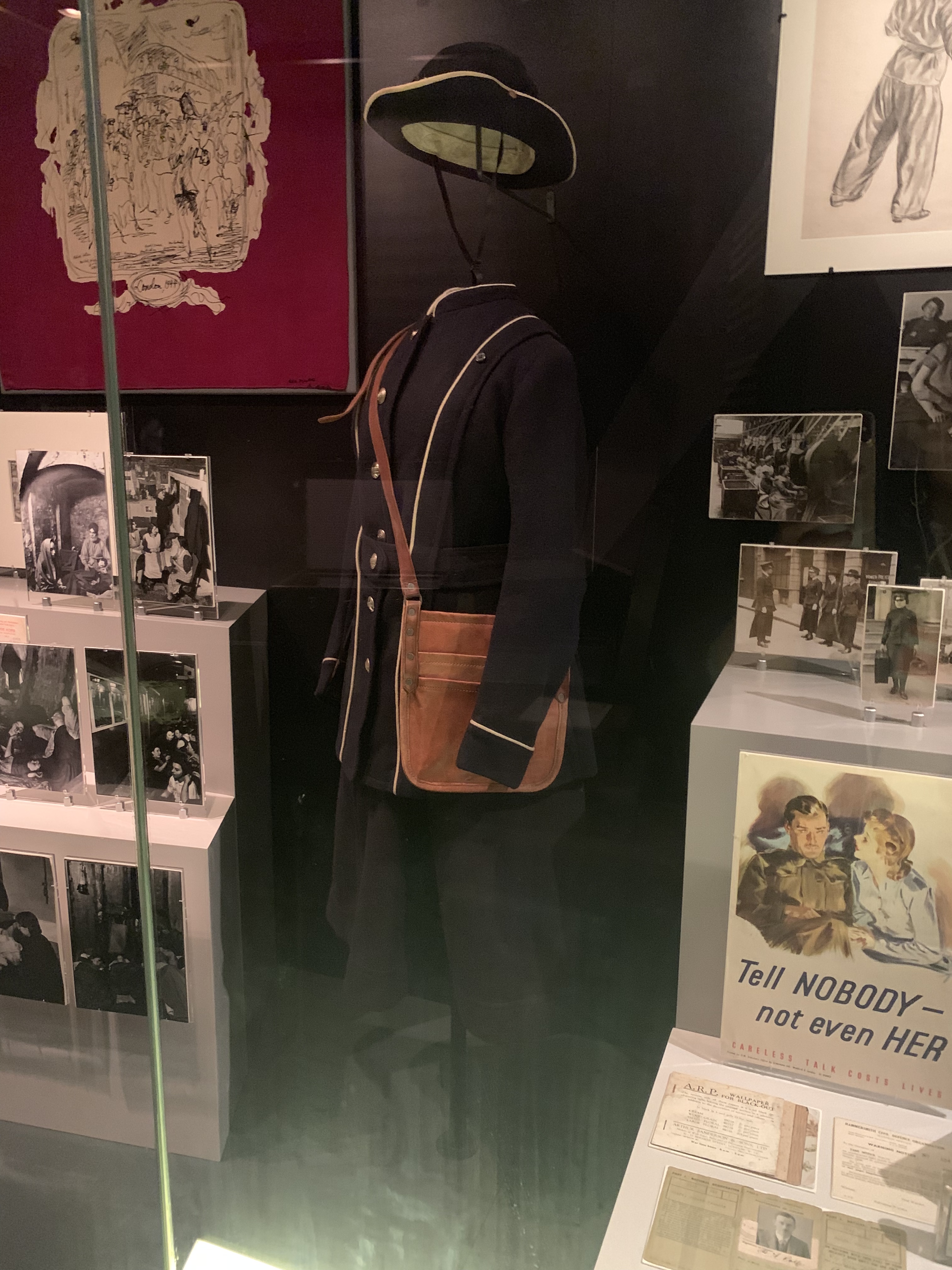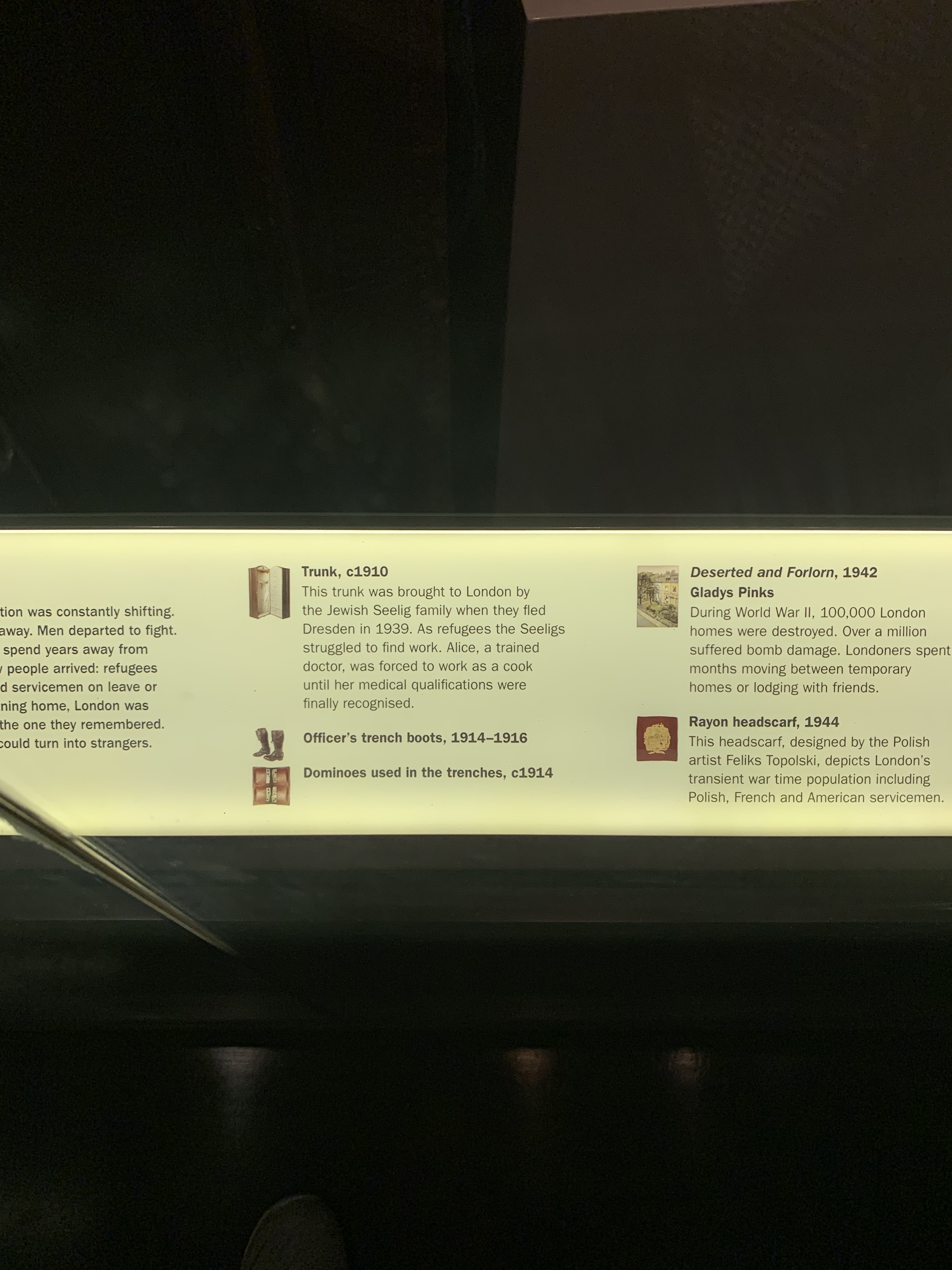 The First World war had an impact on the lives, the psyche and the everyday objects surrounding the people of London. The participation of women in the forces introduced the female uniform, and mass displacement of people meant that suitcases and portable trunks were needed to lug around one’s possessions during this testing time. This period was followed by a general wave of political and public unrest, as reflected in ‘Prison made’ objects and propaganda poster stencils.