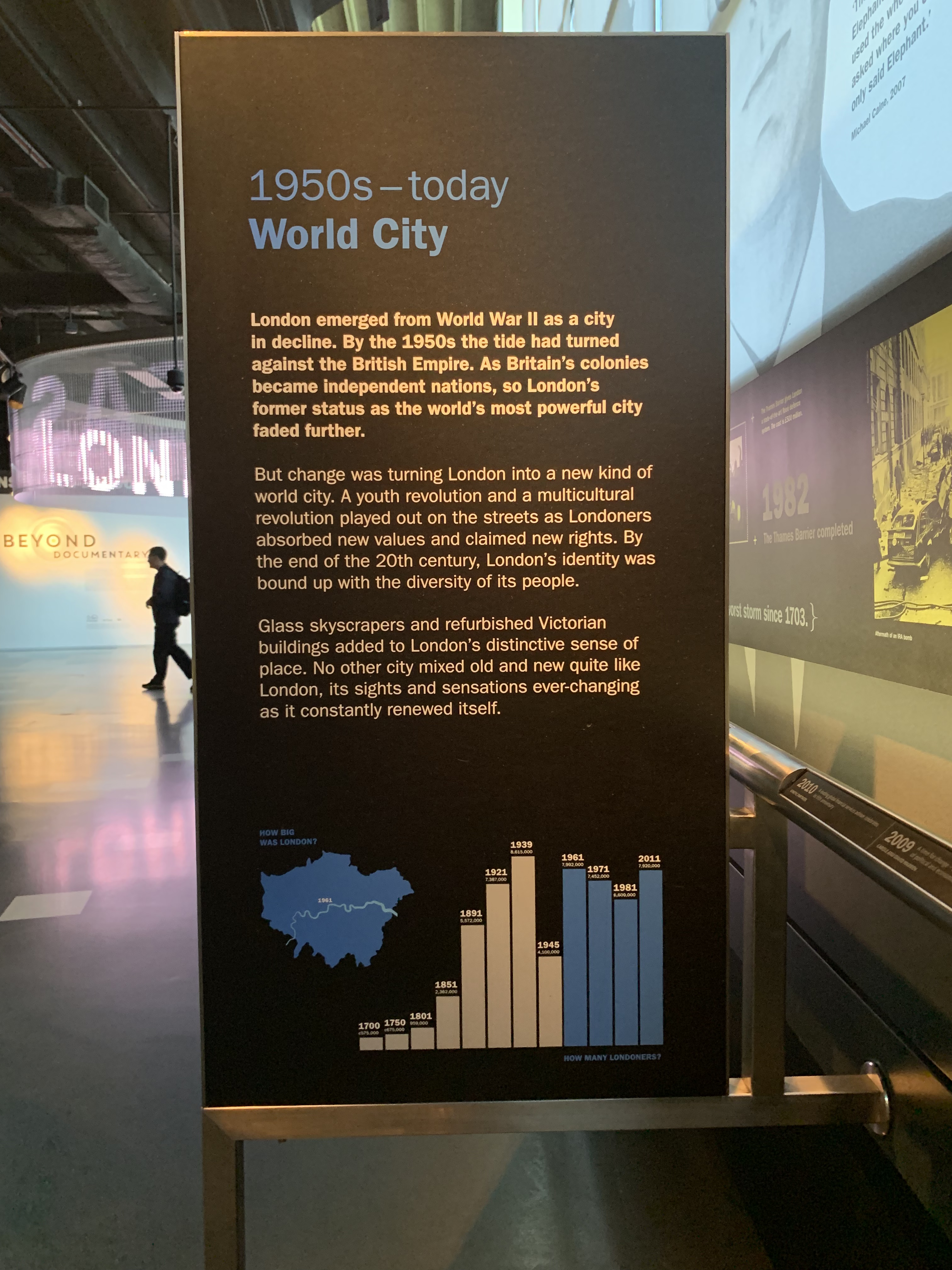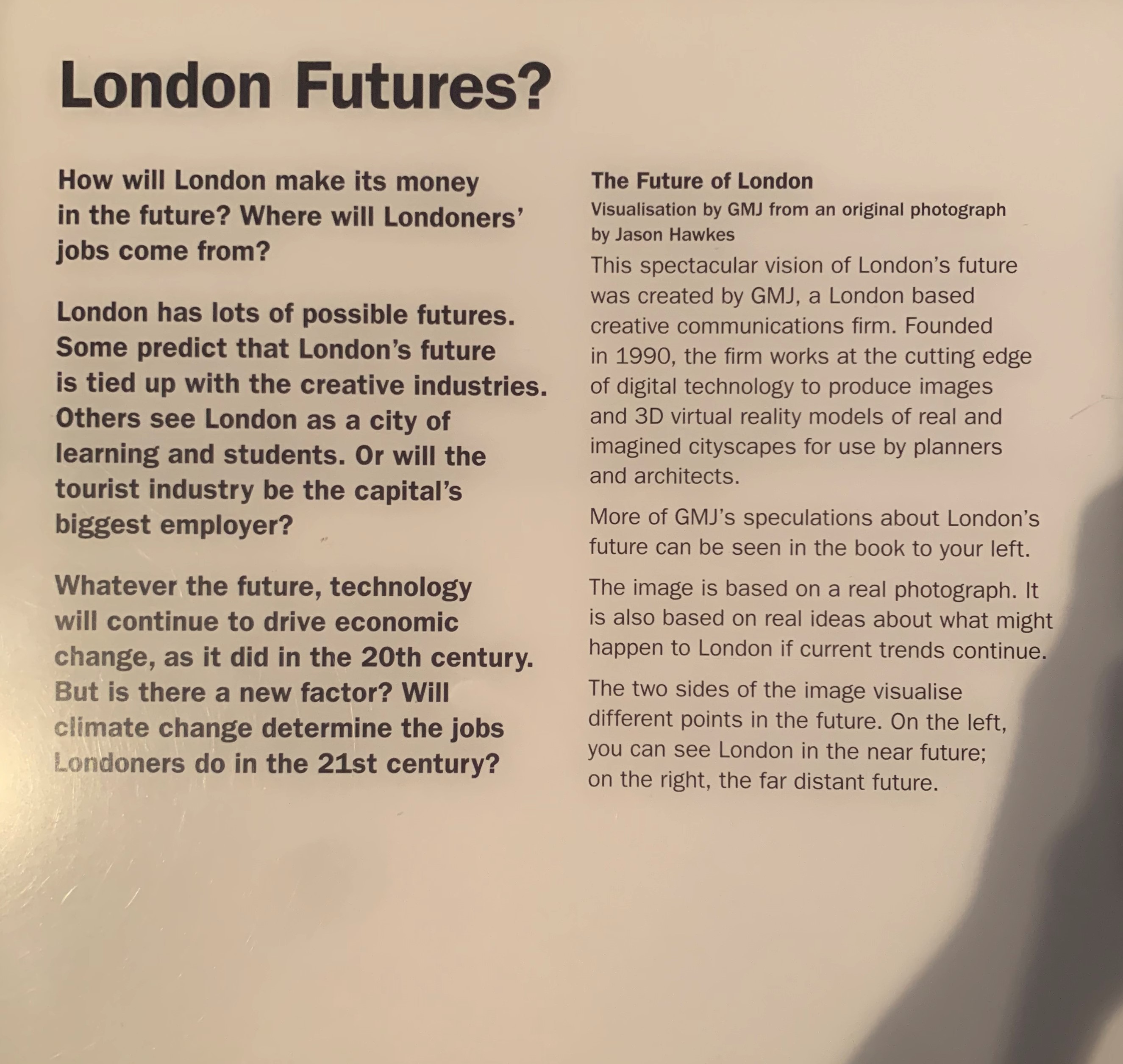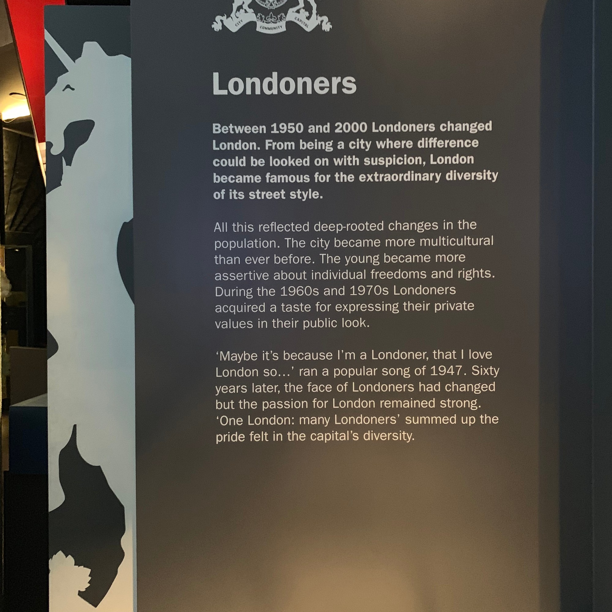 This was an interesting piece projecting possible future situations for the city through photo montages and textual explanation. The artist’s view of the future of London was sometimes scary, sometimes progressive, and most times potentially controversial. It made me think about the future of the city based on the trajectory of historical change as documented in the museum.