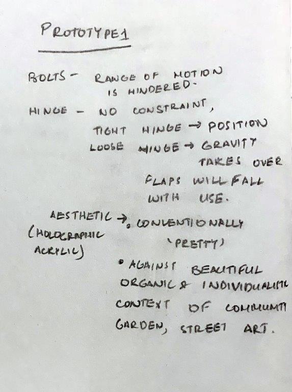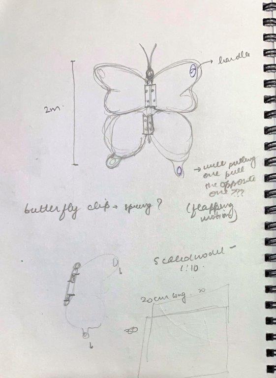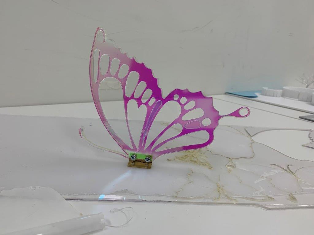 With regards to the material and aesthetics of the wings, I don’t like the conventionally ‘fairy tale-like’ or girly connotations of the holographic acrylic. The clear acrylic seems like a better option, and I can imagine artists painting their ‘versions’ of a butterfly on it over time. Overall, acrylic is an expensive material to use for the scale I’m looking at. Moreover, it doesn’t respond to the organic beauty of the site and the Nomadic gardens beyond.