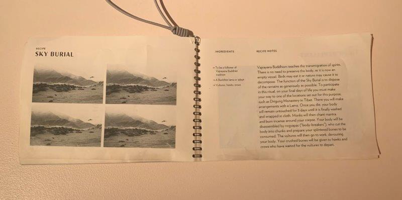 ‘To Flavour Our Tears’, looks at putting humans within the animal food cycle within a restaurant project- a radical idea, given that we humans have never been actually interested in the food cycle of animals, let alone offering ourselvs as part of it. Sky burials allow scavengers to break down human bodies after their death, while moth bars ‘feed’ moths with salt from human tears. Through an accompanying recipe book, the designers suggest ‘Flavouring ourselves’ to suit the tastes of other species, a reading that I found both ingenious and hilarious.