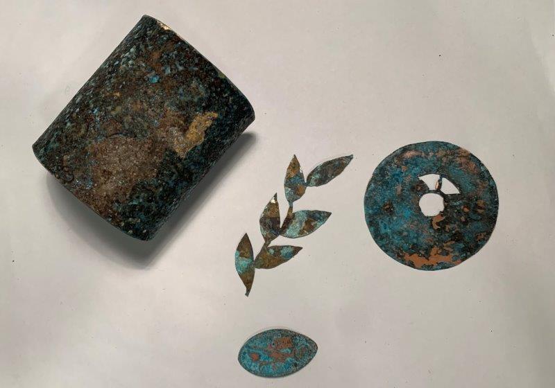 2. This time I first dipped my brass and copper objects in vinegar, sprinkled with rock salt, and placed them within wads of tissue paper soaked in ammonia, based on this recipe. I realized that copper took on deep blue patinas almost immediately, while brass took time to develop the effect. I re-introduced my brass cuff to get a deeper patina through the wadding method.
