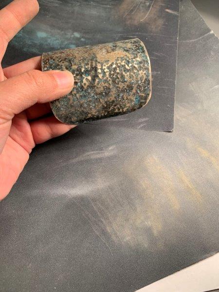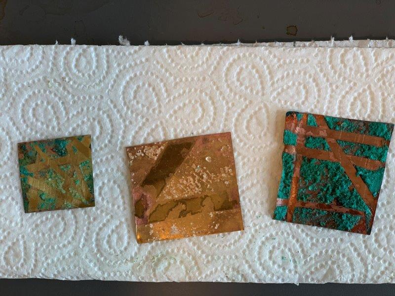 Having removed the electrical tape, I noticed different effects in the 3 pieces. one of the brass pieces (left), bought from a jewellery supplies store, showed blue-green salt crust, and a clear gold in areas masked with tape. The other brass piece (middle) bought from a hardware store in India, showed slight pink patination around its edges, with brown smoke-effect patina in areas where the vinegar reacted with the glue from the tape. The copper piece showed thick deposits of bright blue salt and patina underneath, leaving clear trails under the masked areas. I’m not sure whether I’d like to sand these pieced down yet, or let them sit with their salt crusts…