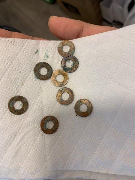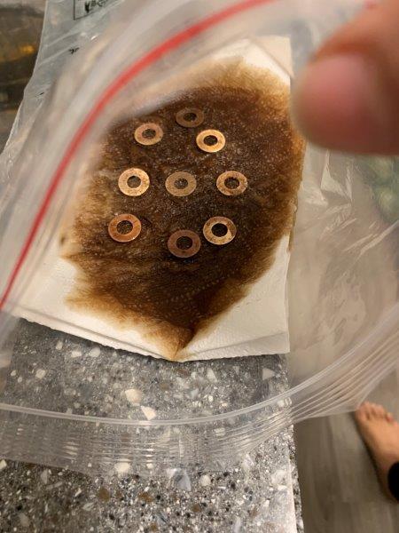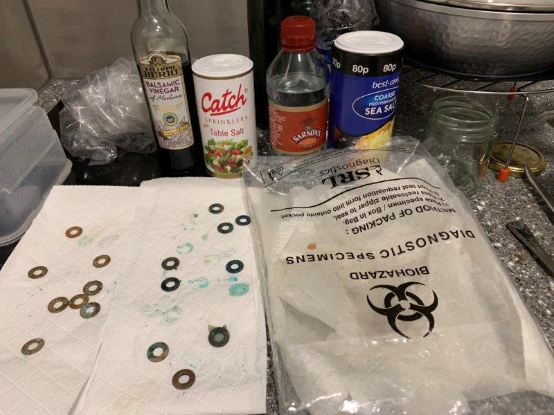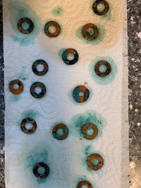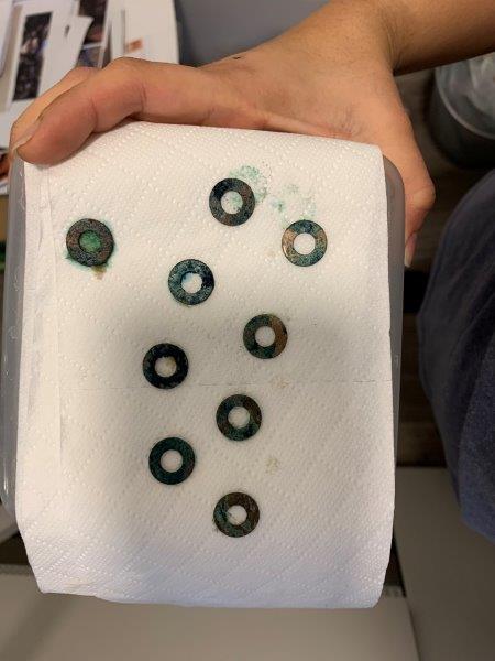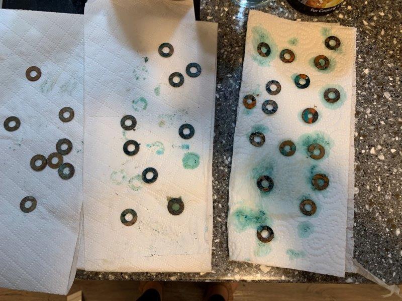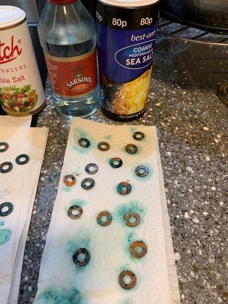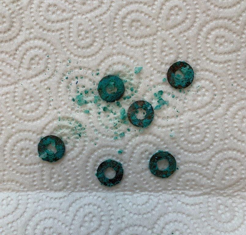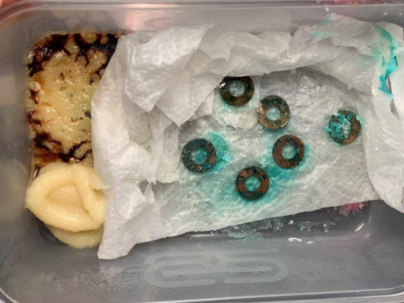 After 2 hours – exposed to heated garlic vapours and sitting in lukewarm water. Top 2 washers – brass, Bottom 4 – copper.