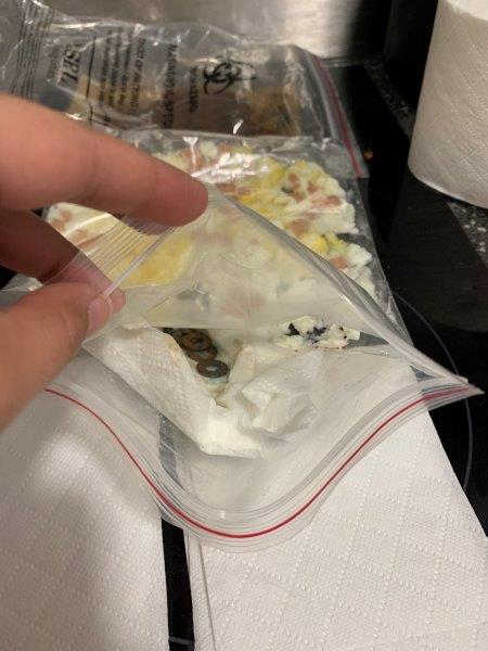 I thought that removing Equation 3 & 6 (basically removing the source of sulfur i.e. ammonia) would still allow the blue, red and black hues to appear in the presence of oxygen and water. Simultaneously, I put a similar set of vinegar dipped and salt sprinkled copper washers in a plastic bag with crushed, freshly boiled eggs. This was based on this recipe, which suggested the comparatively less smelly use of eggs as a source of sulfur to equations 3 & 6.