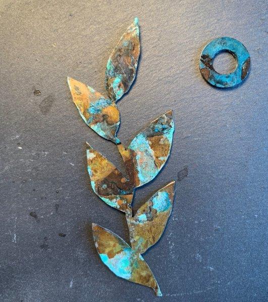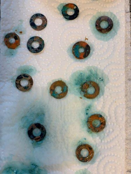 5. Excited about this new technique, I tried the wadding process with copper washers in balsamic vinegar and fine table salt (for a lack of a fancier pantry). I avoided ammonia this time, on the basis of my reading of this article that explained the chemical processes behind the different colours achieved during the patination.