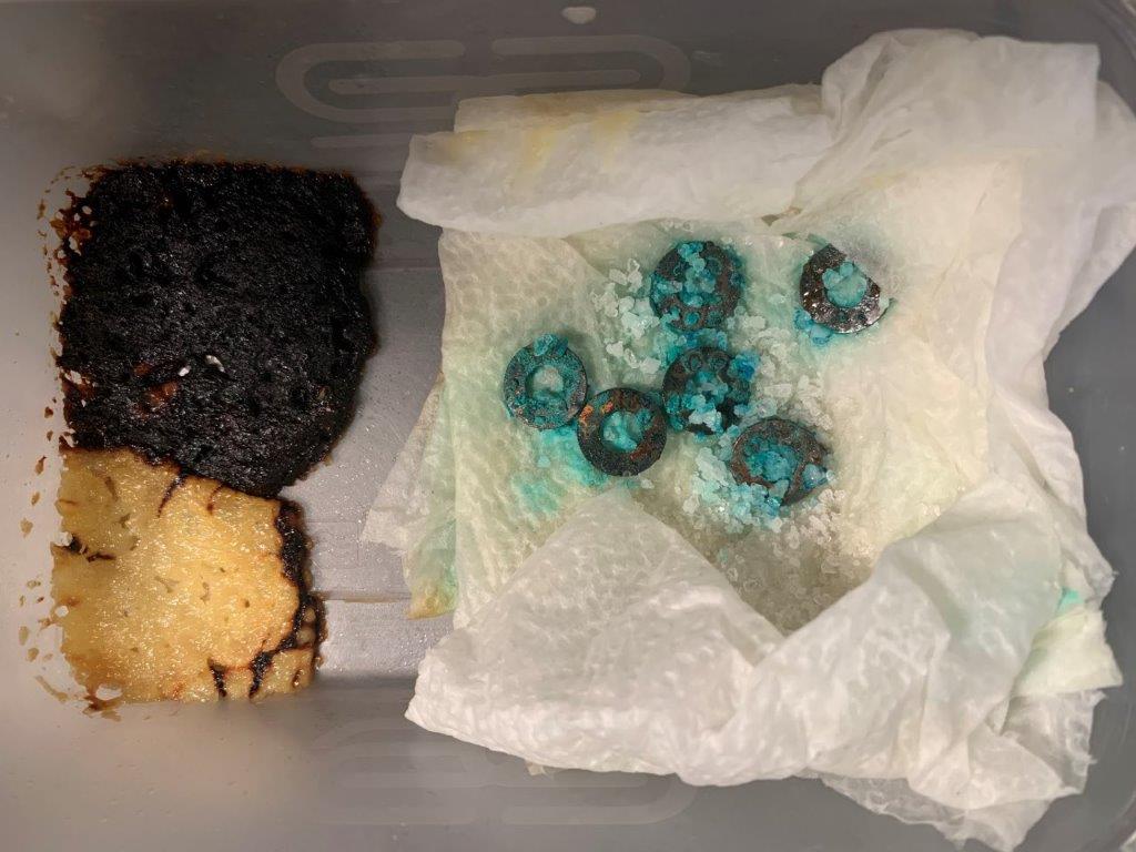 After about 24 hours, the washers wadded without being fumed with egg sulfur showed very little blue patination, and there was no black residue at all. Whereas, the washers exposed to crushed eggs showed not only more blue, but also had a darker, black and brown residue.