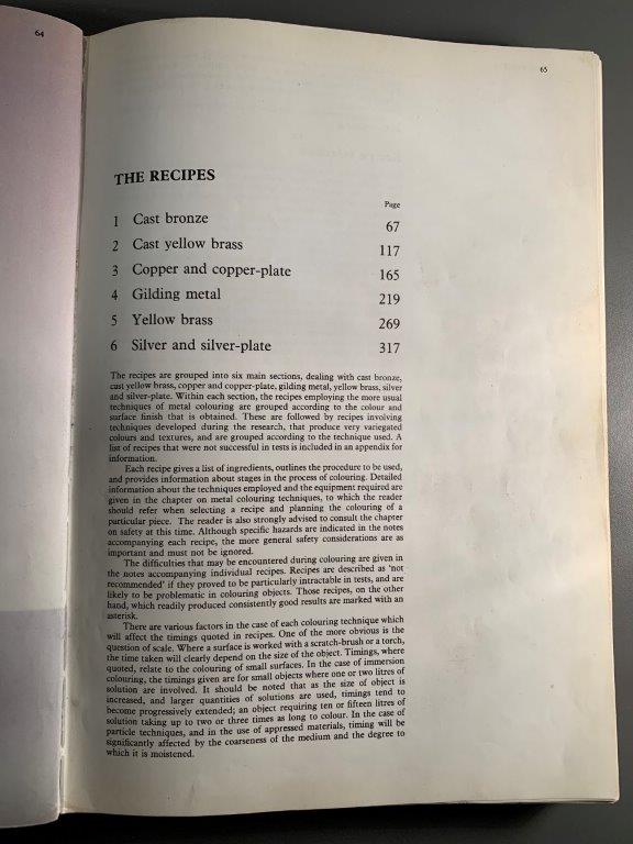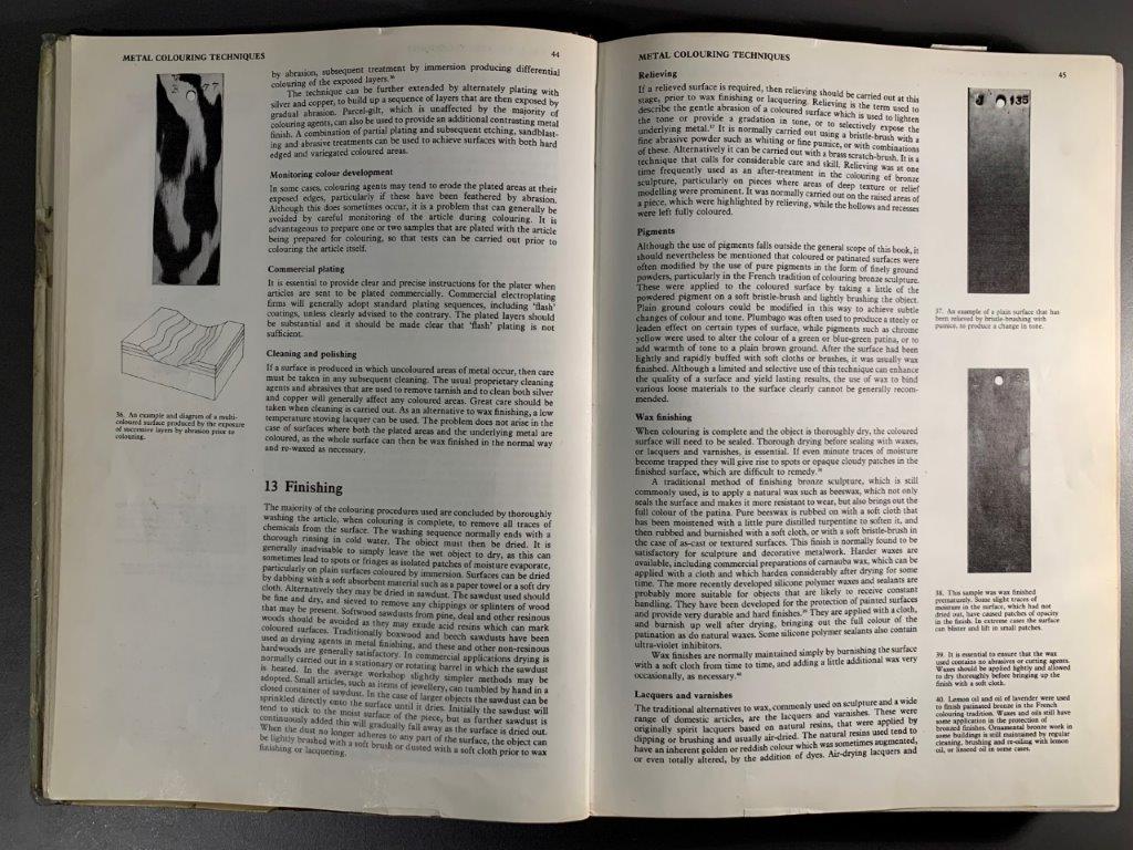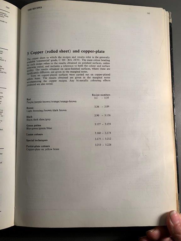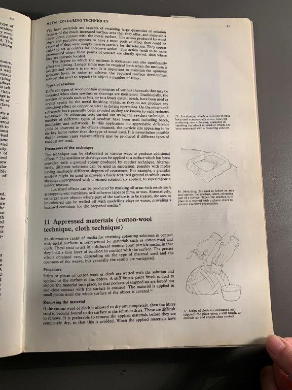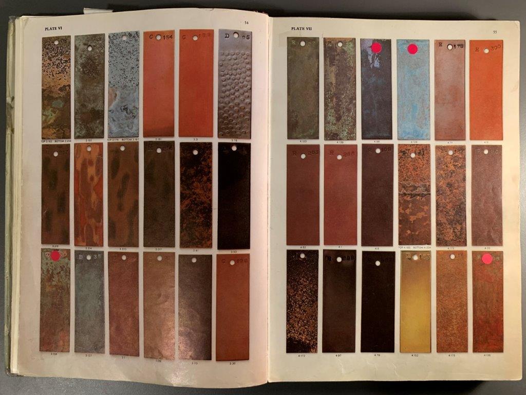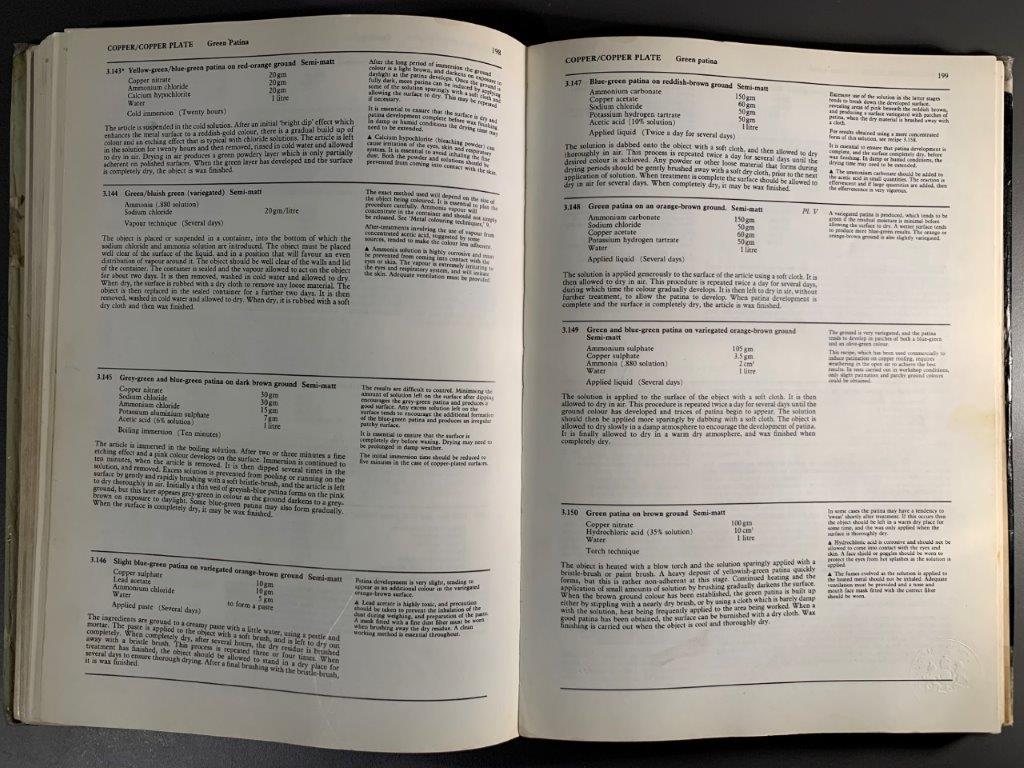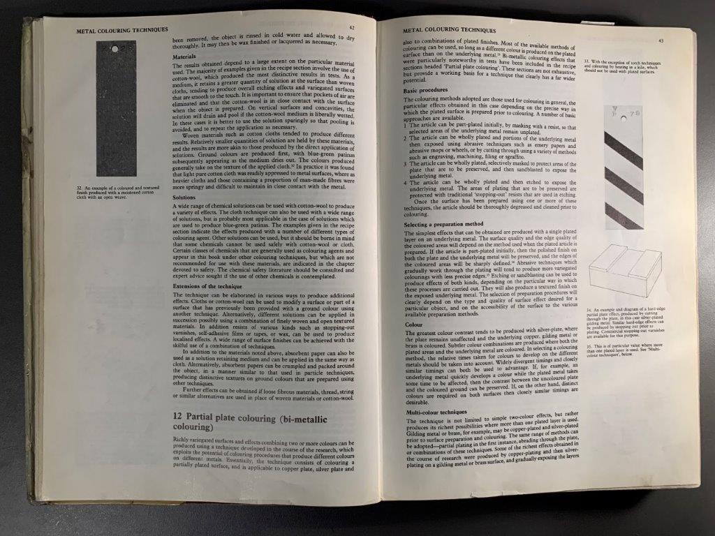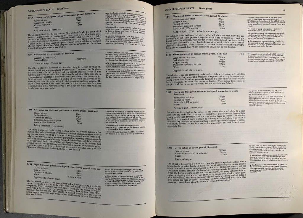 The book contextualizes patination in art and craft through historical times, and mentions some achievements in patination techniques in French, Japanese and Chinese crafts movements. Beyond this, it is a kind of recipe book, showing images of patinated plates and directing the user to the ‘recipe’ to achieve the desired effect. I like the format of this documentation of practical research, and would like to document my experiments in the same way.