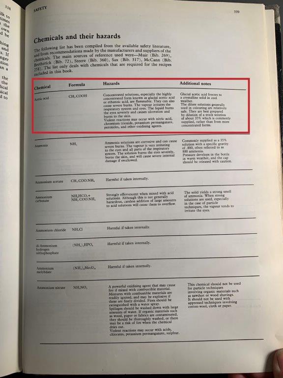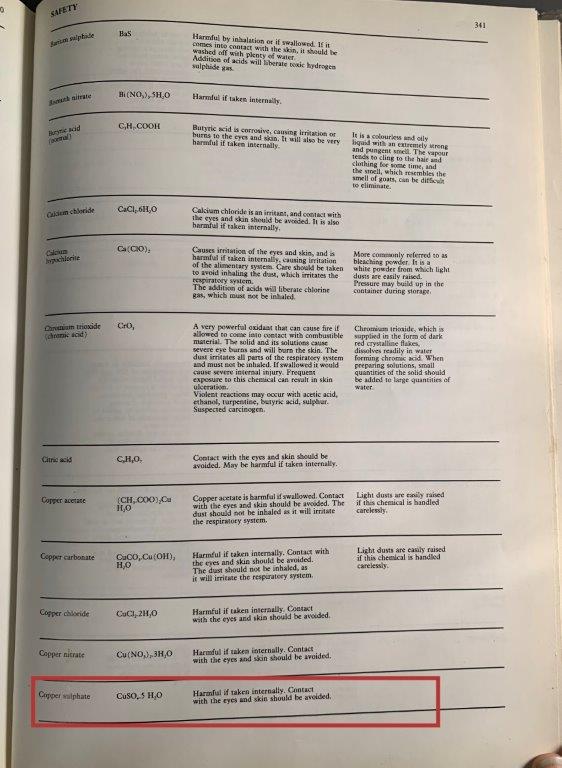 The book mentions safety procedures and potential hazards of all chemicals mentioned. Copper sulphate and white vinegar (diluted 4-7% ascetic acid) used for most of my processes, are deemed safe during experimentation, but copper sulphate is toxic if ingested.