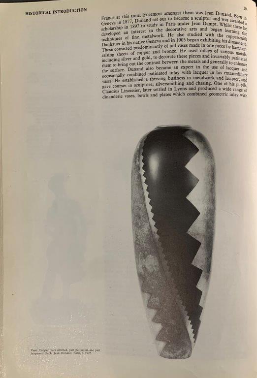 I realized that I had already been using some methods of immersion and coating mentioned in the book, such as sawdust technique, fuming (called vapour method), Wadding (called cotton wool method) and masking (called partial plate colouring). However, there are some other techniques that I would really like to try, depending on access to equipment, such as the torch technique and heat colouring, that were also mentioned in my Realize crit. Another creative application of patination that I would like to try is the combination of metals and the processes of patination and lacquering on a single artefact, as displayed in the vase by Jean Dunand.