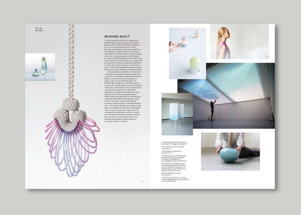 Materials, textures, colours: I like how materials are the stars of this spread. It somehow reflects the process without making it look like a scrapbook. Process is another aspect I’d like to highlight in a printed publication (maybe even more than final outcome, since my practice for Stage 2 has been driven by a responsive, spontaneous approach toward material interaction, rather than being focused on a single end goal throughout)